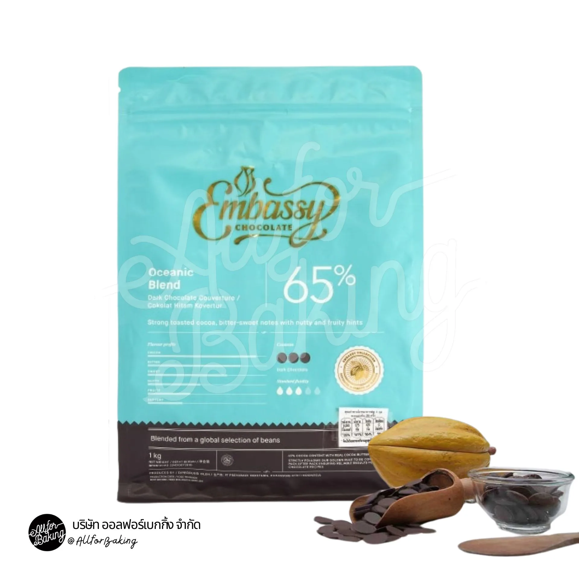 The Embassy Oceanic Blend Dark Chocolate Couverture 65% comes in a coin form and has 43% fat content. Upon tasting, there’s an initial acidity that is immediately followed by notes of dried fruits, along with hints of nuts that complement a rich chocolate flavor.